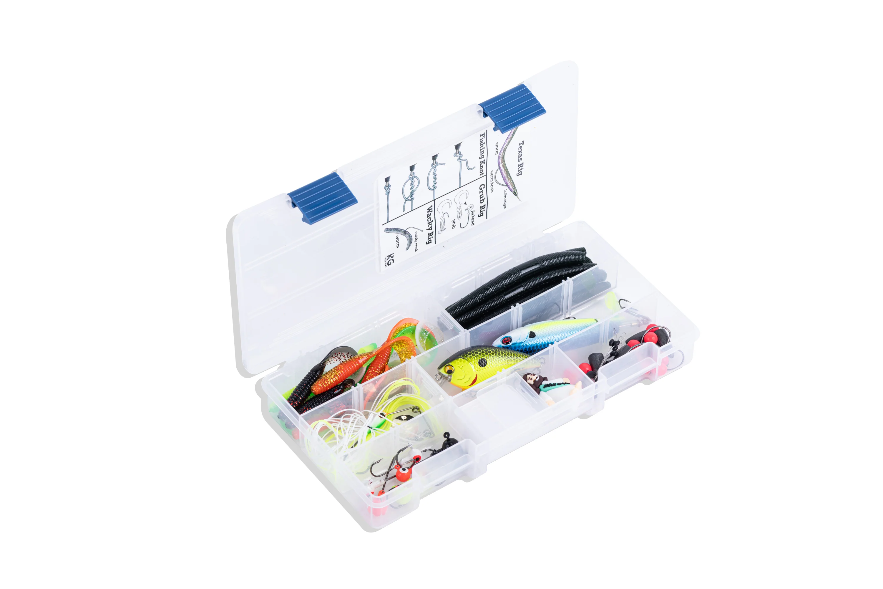 The KG Bass Fishing Kit has everything you need to catch Bass, whether you're a beginner or a seasoned angler. It's packed with all the essential tackle, neatly organized in a compact and durable tackle box.
